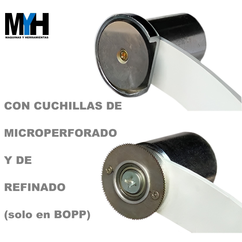 Equipada con cuchillas para refinado del rollo y el microperforado, el cual permite que se desprendan los acabados en vez de utilizar el cúter, (solo aplicable en el BOPP)