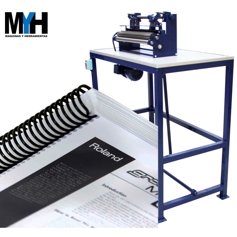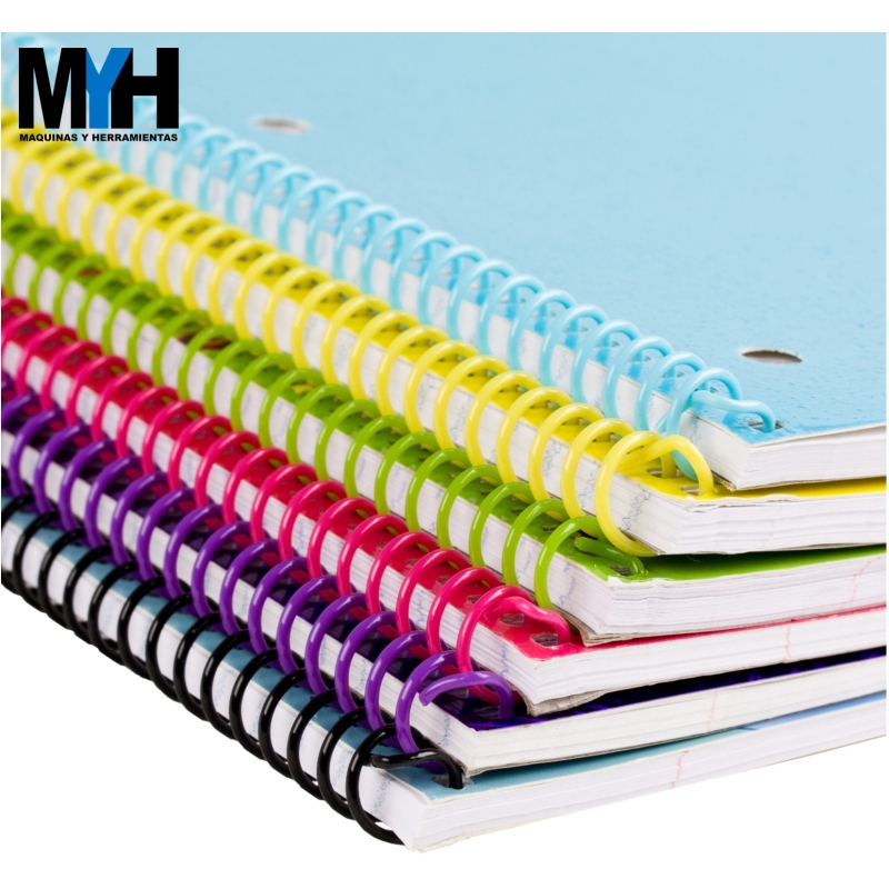 Con está maquina el trabajo de insertado, corte y doblez del arillo espiral plástico se simplifica y se agiliza, logrando hacer altos volúmenes de acabado.