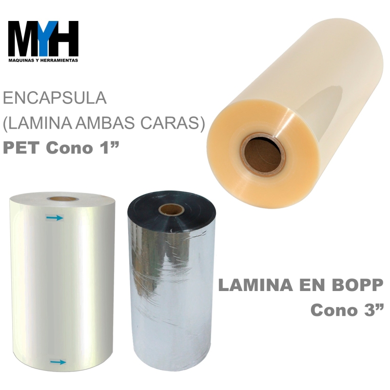 - Así mismo las películas para encapsular (PET) también vienen en cono 1” y en diferentes grosores (milésimas) desde 1.5 hasta 10 milésimas, llegando a haber hasta de 14 milésimas (no muy comercial en México.