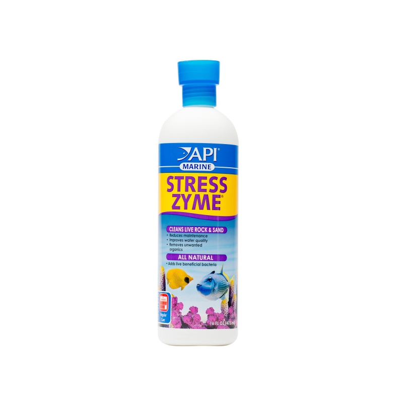 API MARINE STRESS ZYME, es un limpiador que contiene bacterias vivas que ayudarán a mantener limpio tu acuario, reduciendo así la necesidad de un mantenimiento constante además de mantener un filtro biológico fuerte.