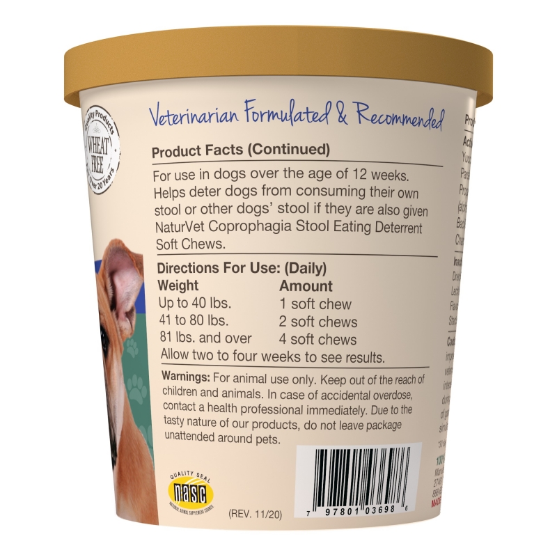 NaturVet Coprophagia ayuda a disuadir a los perros de consumir sus propias heces o las heces de otros perros. También se recomienda para ayudar a ayudar a reducir el olor desagradable de las mascotas. Contiene un refrescante para el aliento, así como enzimas y probióticos.