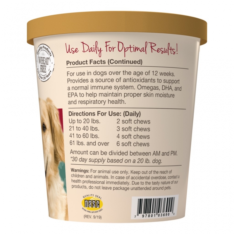 Para uso en perros mayores de 12 semanas. Proporciona una fuente de antioxidantes para apoyar un sistema inmunológico normal. Sus omegas, DHA y EPA ayudan a mantener la humedad adecuada de la piel y la salud respiratoria de tu canino.