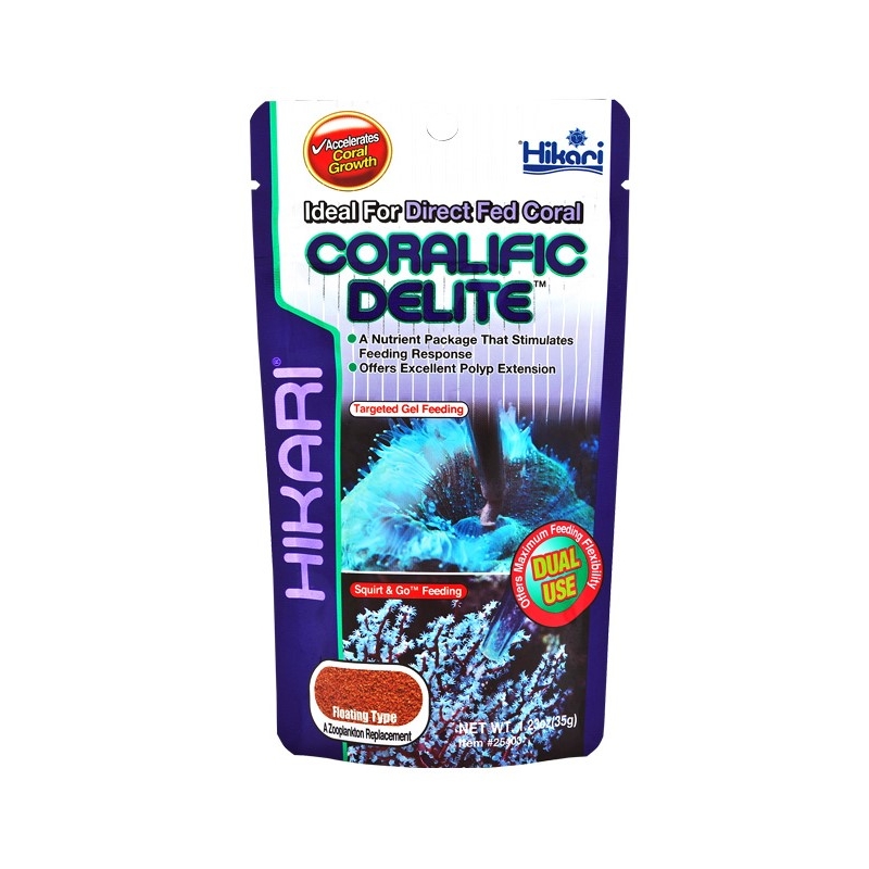 Coralific Delite es una dieta desarrollada específicamente para los corales y sus necesidades nutricionales únicas al tiempo que ofrece dos modos de alimentación: "Alimentación en gel dirigida" (Ideal para muchos LPS y anémona de mar que tienen bocas más grandes) directamente en la boca de un coral específico o aquella que permita que los pólipos de coral para capturar la comida en la columna de agua como lo harían con el zooplancton (Ideal para corales blandos como el coral córneo y plumeros que tienen una boca más pequeña.).