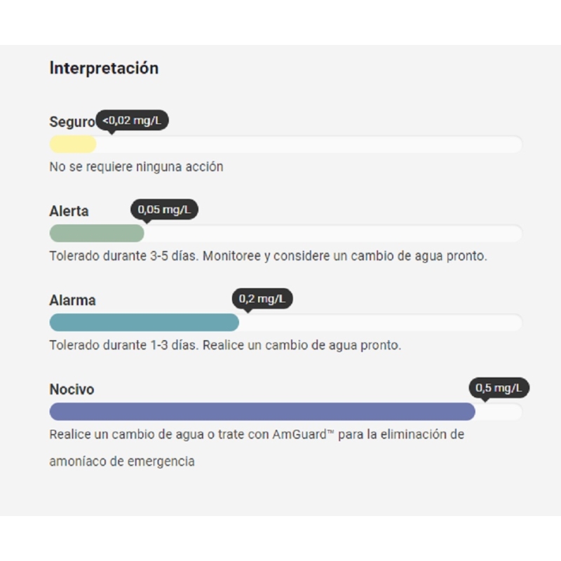 El amoníaco libre es mucho más tóxico que el amoníaco ionizado. Como amoníaco libre, el color ALERT corresponde a aproximadamente 0.05 mg / L, ALARM a aproximadamente 0.2 mg / L y TOXIC a aproximadamente 0.5 mg / L. La administración de un cambio de agua debe considerarse para cualquier indicación que no sea SEGURA. La concentración de ALERT se tolera durante 3-5 días, ALARM durante 1-3 días, y TOXIC es rápidamente dañino, requiriendo atención inmediata. Para la eliminación de amoníaco de emergencia, tratar con AmGuard.