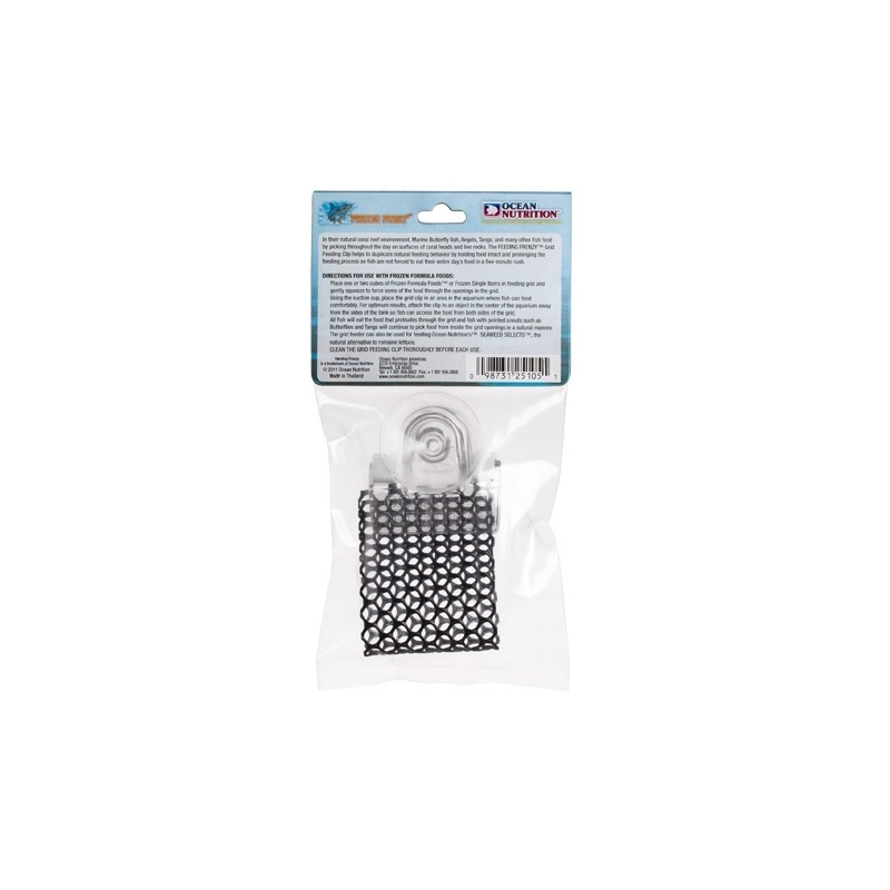 En sus entornos naturales de arrecifes de coral, los peces comen recogiendo rocas y cabezas de coral y cazando en grietas durante todo el día. Feeding Frenzy Grid Feeding Clip de Ocean Nutrition satisface este instinto de alimentación natural al mantener los alimentos intactos bajo el agua y prolongar el tiempo de alimentación, por lo que los peces no se ven obligados a comer la comida de todo el día en un apuro de cinco minutos. El clip incluye una bolsa de malla para contener alimentos congelados a base de gel semicongelados y una ventosa que les permite fijarse fácilmente a la superficie interior de los acuarios de acrílico o vidrio. Este clip es ideal para alimentar alimentos de fórmula congelados y selecciones de algas marinas de Ocean Nutrition.