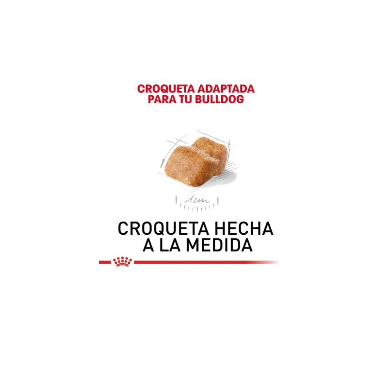 Con una mandíbula superior más corta que la mandíbula inferior y una cabeza plana casi tan ancha como larga, el Bulldog es un claro ejemplo del tipo de raza braquicéfala. Las croquetas Bulldog Inglés Cachorro están exclusivamente diseñadas para facilitar la prensión y la masticación en el Bulldog.
