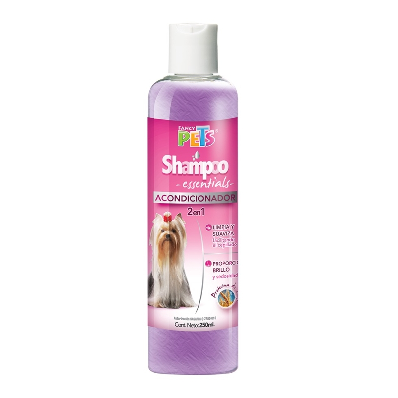El Shampoo Essentials y Acondicionador 2 en 1 de Fancy Pets limpia y suaviza el pelo al mismo tiempo, proporcionándole brillo y sedosidad al tacto. No irrita la piel ni los ojos del perro.