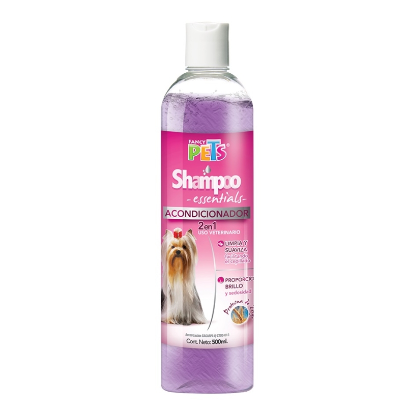 El Shampoo Essentials y Acondicionador 2 en 1 de Fancy Pets limpia y suaviza el pelo al mismo tiempo, proporcionándole brillo y sedosidad al tacto.