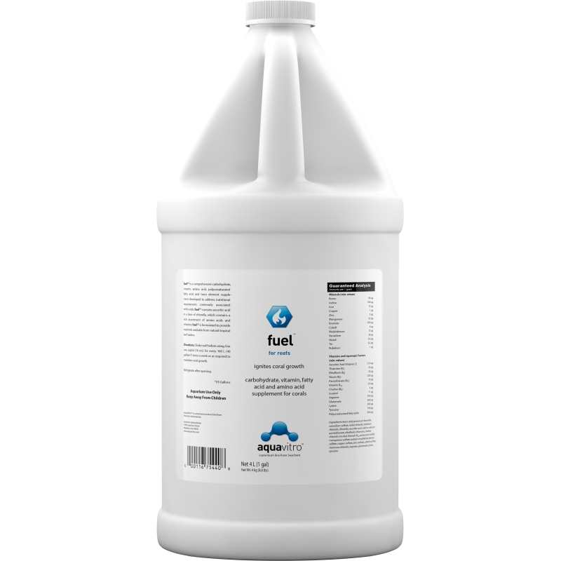 Fuel™ es un suplemento integral de carbohidratos, vitaminas, aminoácidos, ácidos grasos poliinsaturados y oligoelementos desarrollado para abordar los requisitos nutricionales comúnmente asociados con los corales. El combustible™ contiene ácido ascórbico en una base de chlorella, que contiene una rica variedad de aminoácidos y vitaminas. Los beneficios para la salud de la chlorella son ampliamente conocidos y mientras que la espirulina, un alga similar, se ha utilizado regularmente en la industria, aquavitro es el primero en utilizar la chlorella muy superior. El combustible™ está formulado para proporcionar nutrientes disponibles en las aguas naturales de los arrecifes tropicales.