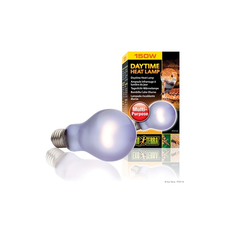 Una lámpara de luz diurna de amplio espectro con una funda de neodimio. El espectro es ideal para la fotosíntesis de la planta y la luz UVA (ultravioleta A) contribuye al bienestar fisiológico de los reptiles. Otro factor importante es el calor emitido por esta bombilla para aumentar la temperatura ambiente general en el terrario.