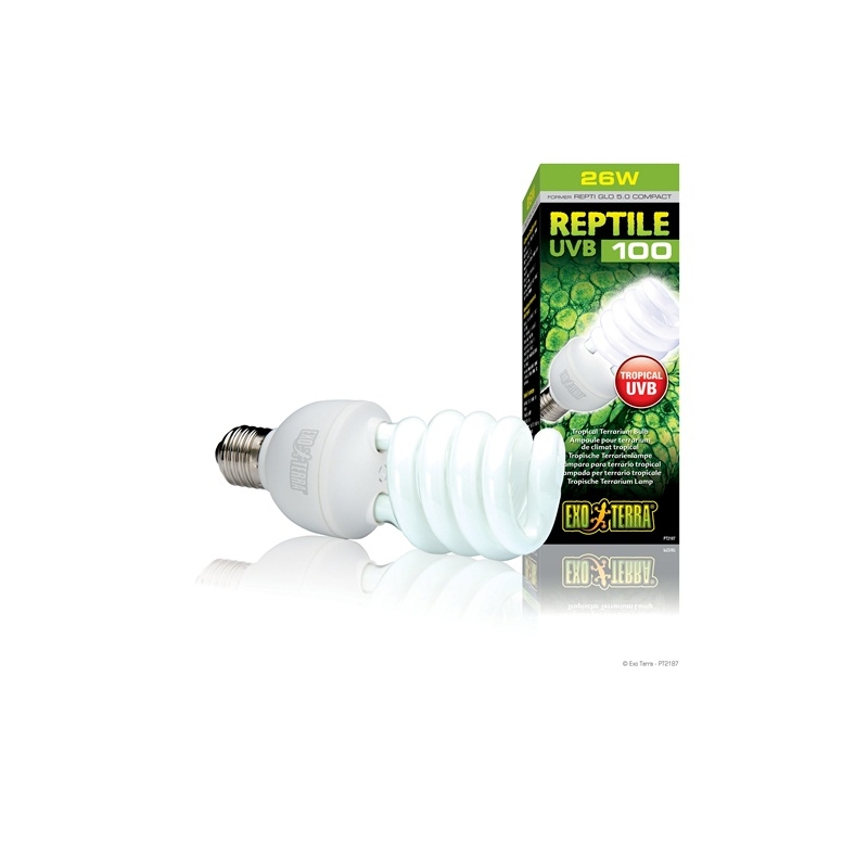 El Exo Terra Reptile UVB 100, 26W tiene una salida UVB moderada a alta, similar a la de ambientes sombreados como las selvas tropicales y otros lugares tropicales. Los reptiles que viven en estos hábitats reciben menos radiación UV debido a las muchas condiciones climatológicas (humedad bastante alta, cambios en el clima, etc.) que impiden que la luz solar directa llegue a ellos o a sus sitios para tomar el sol.