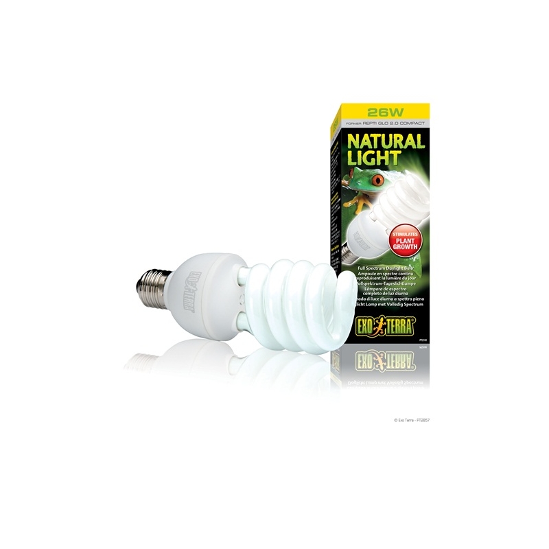 La Exo Terra Natural Light- 26W es una fuente de luz general con una alta salida de luz visual y un índice de reproducción cromática (CRI) muy alto, pero una radiación UVB más baja.