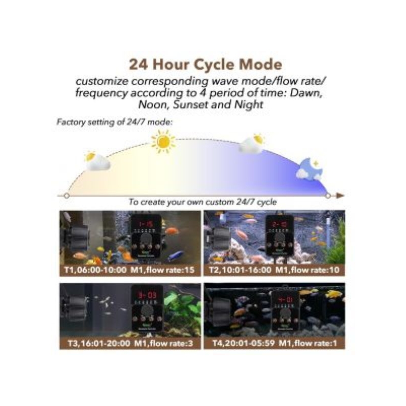 En el modo 24/7, la bomba wavemaker divide las 24 horas en 4 rangos de tiempo, en los que puede personalizar el caudal y elegir entre 5 modos de flujo de agua y modos de onda diferentes.