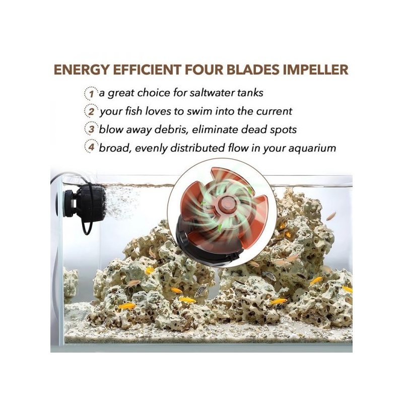 Diseñada con motor sin escobillas y tecnología de onda sinusoidal, la bomba de onda de CC hygger tiene un potente impulsor de 4 palas, se mueve alrededor del agua del acuario y ayuda a los desechos aspirados por el filtro, manteniendo el agua limpia e imitando la corriente natural para que sus mascotas acuáticas naden de manera inteligente. Es tan silencioso que no perturbará su sueño cuando esté en uso en el dormitorio. El generador de olas de alto GPH para 55-150 galones de agua salada, agua dulce y tanques de arrecifes de coral.