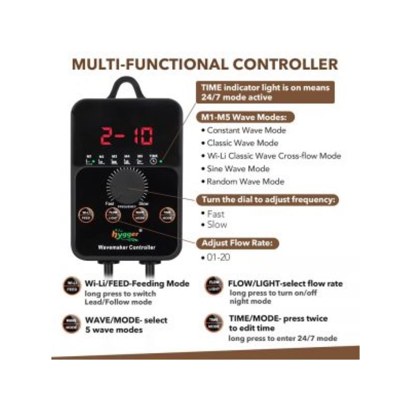 El controlador externo proporciona control del modo de onda, el caudal, la frecuencia y la programación para el modo personalizado 24/7 y el modo único de configuración rápida, el modo de alimentación de 10 minutos con un solo toque, un sensor nocturno que ralentiza automáticamente el flujo de las olas cuando se apagan las luces del tanque y un enlace inalámbrico para sincronizar y controlar múltiples bombas de olas en acuarios.