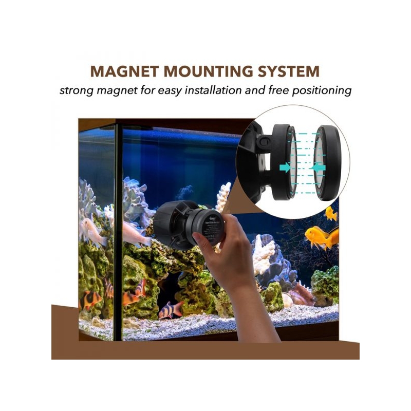 La bomba de onda de CC para acuarios viene con un soporte magnético para una fácil instalación, posicionamiento libre en acuarios sin mojarse las manos y soportes giratorios magnéticos de 25 grados para la dirección del flujo de agua, proporciona un flujo de agua direccional precisamente donde más lo necesita. La bomba es compacta y fácil de esconder detrás de rocas/decoraciones/plantas, se recomienda para espesores de vidrio de tanques de hasta 3/5" (15 mm).