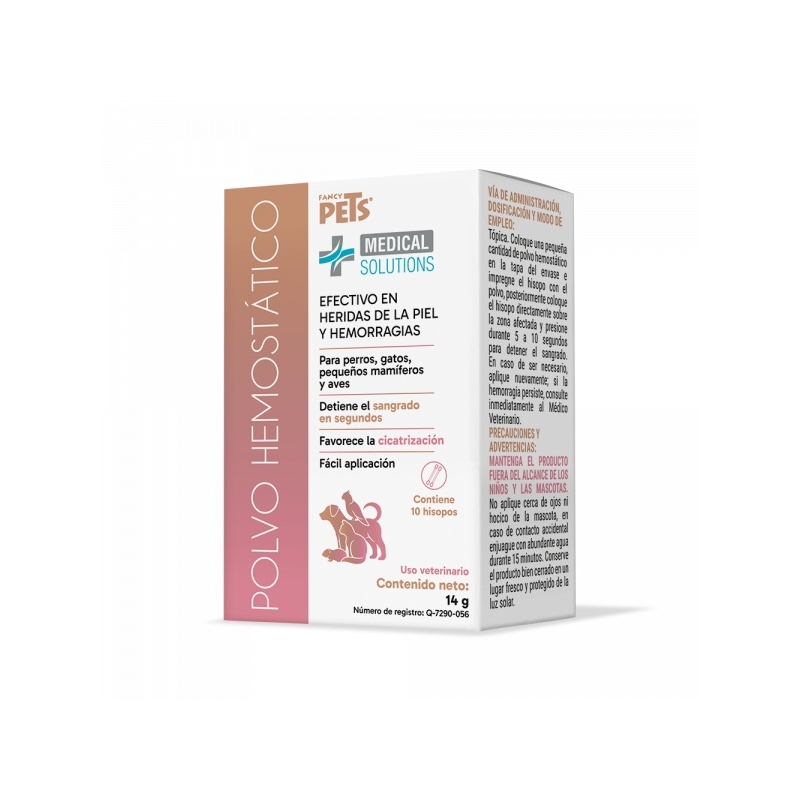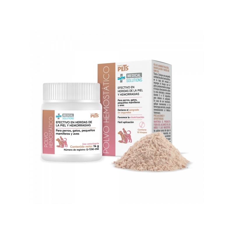 Polvo hemostático de acción rápida para detener sangrados leves en mascotas. Ideal para cortes accidentales en uñas, pequeñas heridas de grooming y rompimiento de primas de sangre en aves.
