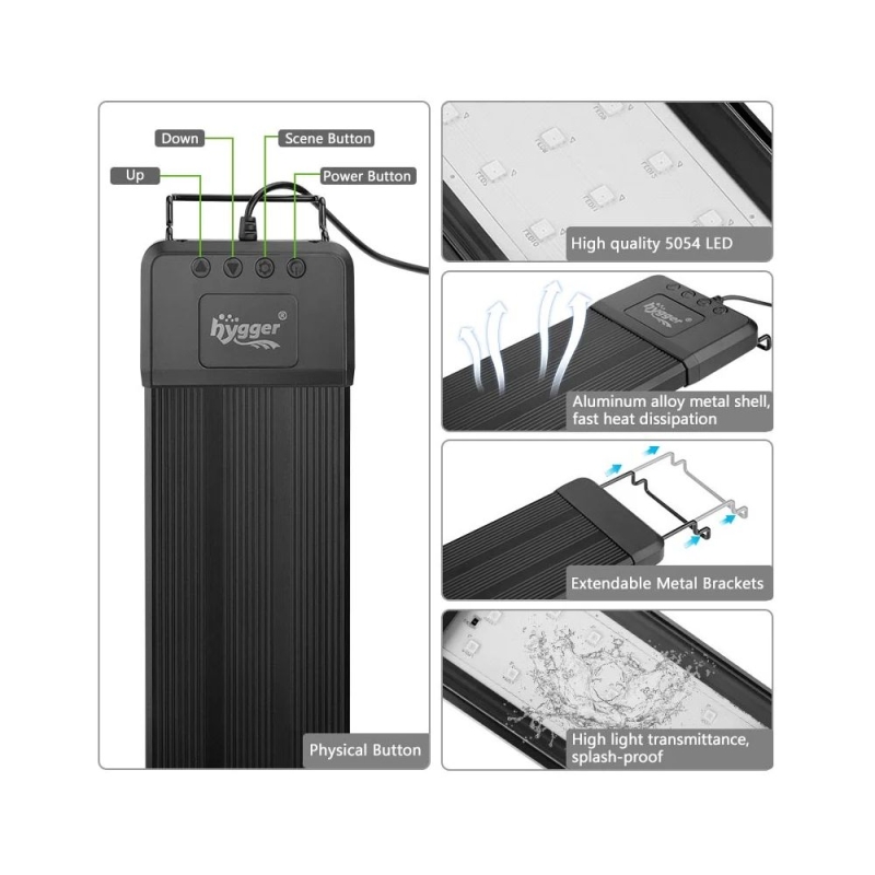 La Lámpara LED Hygger HG028 es una solución de iluminación inteligente que combina tecnología Bluetooth y control mediante la App "TUYA" para ofrecer una experiencia totalmente personalizable sin necesidad de Wifi. Equipada con LED 5054 RGB de alta calidad y un CRI superior a 90, garantiza colores vibrantes y un crecimiento saludable para plantas y peces. Gracias a su diseño de aluminio resistente y soportes extensibles, esta serie se adapta a una amplia gama de tanques, desde 30 cm hasta 140 cm de largo (modelos de 18W a 60W). Es ideal para programar ciclos naturales de amanecer y atardecer, permitiendo ajustar el espectro lumínico para resaltar la belleza única de cada ecosistema acuático.