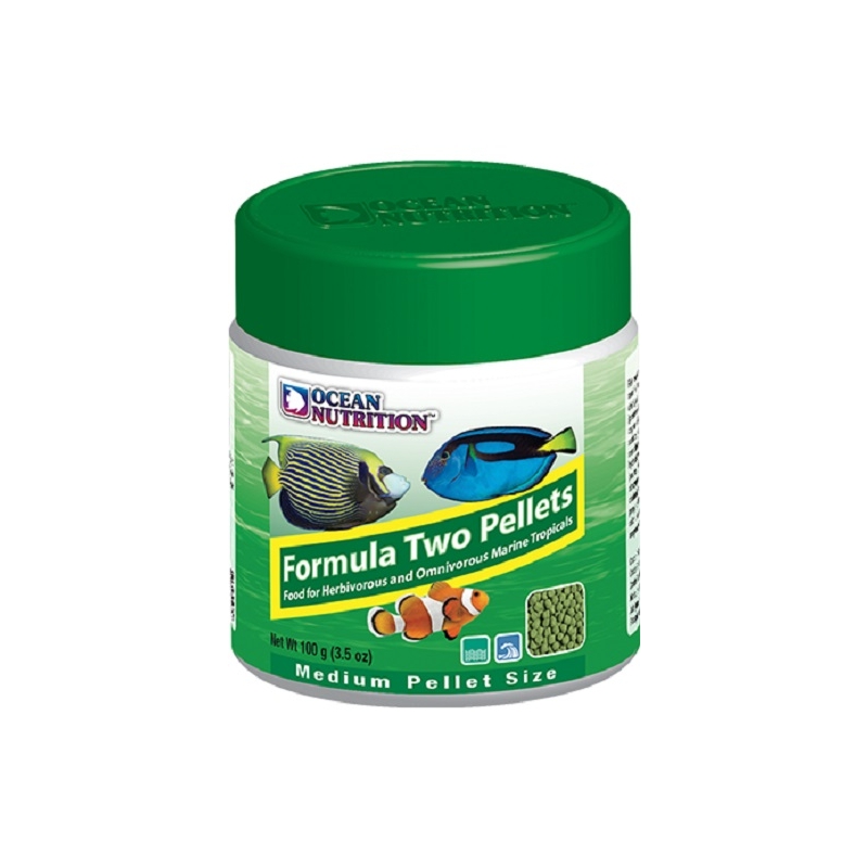 Los gránulos Ocean Nutrition Formula Two son un alimento suave y húmedo de hundimiento lento formulado con mariscos frescos, espirulina (alga verde azulada), algas marinas y ajo. Esta mezcla de ingredientes da como resultado un alimento con un contenido de proteína apropiado para todos los peces tropicales marinos herbívoros (que comen plantas) y omnívoros (que comen plantas y carne). Proporcionan nutrición diaria, apoyan el color y promueven el crecimiento. La inclusión de ajo crea un sabor atractivo que incluso los peces más quisquillosos no pueden resistir. Estos gránulos son ideales para peces herbívoros porque la naturaleza suave y húmeda los hace muy apetecibles y fáciles de digerir. Los peces que comen Formula Two Pellets producen menos desechos en su acuario. ¡Premie a sus peces con la comida que se merecen y aliméntelos con Ocean Nutrition!