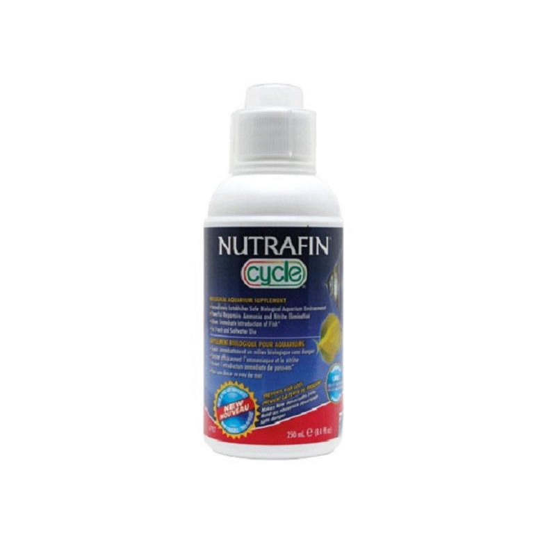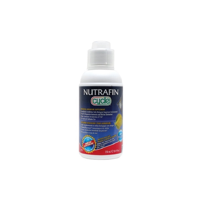 Suplemento biológico para acuario: Nutrafin Cycle es un suplemento biológico eficaz para acuarios que garantiza que todos los acuarios se inoculen inmediatamente con una poderosa cepa bacteriana beneficiosa, para brindarle un hábitat biológico seguro a al pez. Estos microorganismos sumamente eficaces crearán una flora biológica que metaboliza rápidamente el amoníaco y los nitritos mortales. Se recomienda fervientemente el uso de Nutrafin Cycle en los acuarios nuevos, ya que estos no contienen las concentraciones de bacterias beneficiosas necesarias para metabolizar los desperdicios que producen los peces.