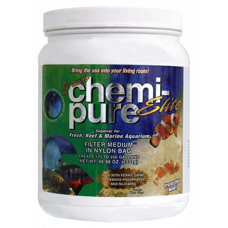 Chemi-pure Elite contiene GFO (óxido férrico granular) para eliminar los fosfatos y silicatos del cuerpo de agua del acuario. Se ha demostrado que GFO es una de las mejores opciones para eliminar y controlar los niveles de fosfato y / o silicato dentro de su acuario.