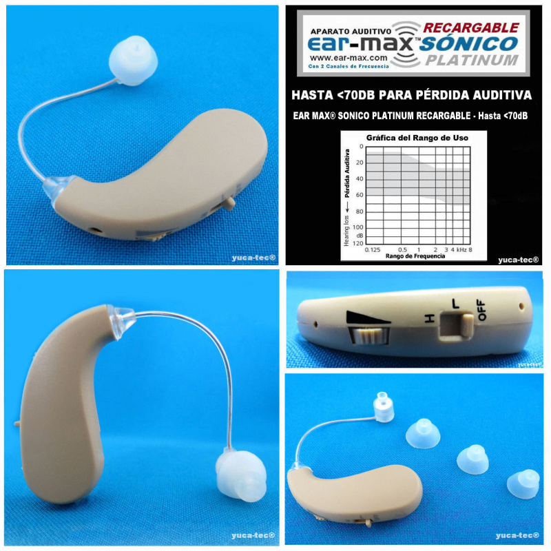 Se recomienda EAR-MAX® SÓNICO PLATINUM Aparato Auditivo Con 2 Canales de Frecuencia para pérdida LEVE A SEMI-SEVERA. (HASTA <70dB)