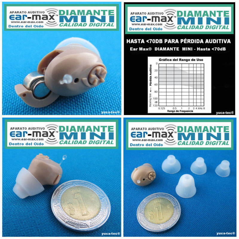 Ear Max® Diamante MINI - Aparato Auditivo Auxiliar - Dentro Del Oído – CALIDAD DIGITAL está diseñado para las personas con pérdida de audición leve a semi-severa (hasta 70dB).