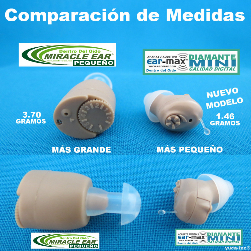 En la foto se puede observar la diferencia de medidas entre nuestro Aparato Auditivo MICRO EAR® (3.70 gramos) y el Ear Max® Diamante MINI - Aparato Auditivo Auxiliar - Dentro Del Oído – CALIDAD DIGITAL (sólo 1.46 gramos). Casi la mitad del peso y tamaño de nuestros auditivos dentro del oído, muy discreto y cómodo.