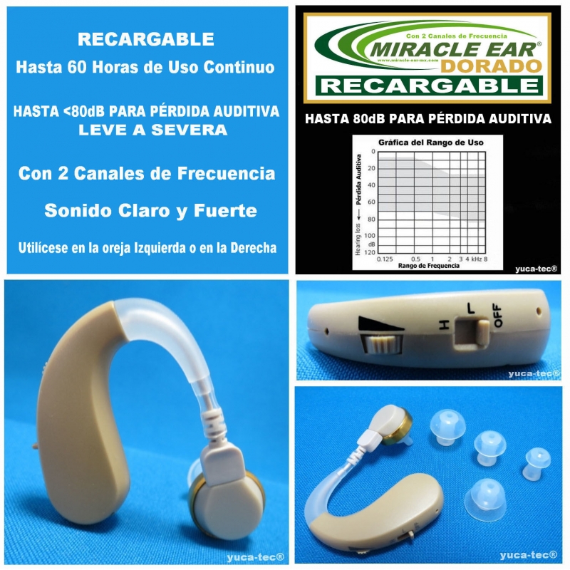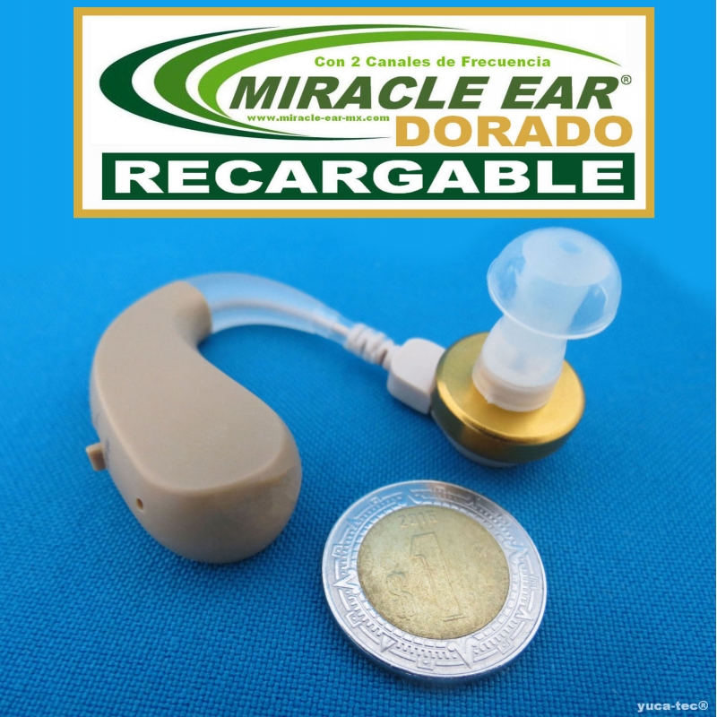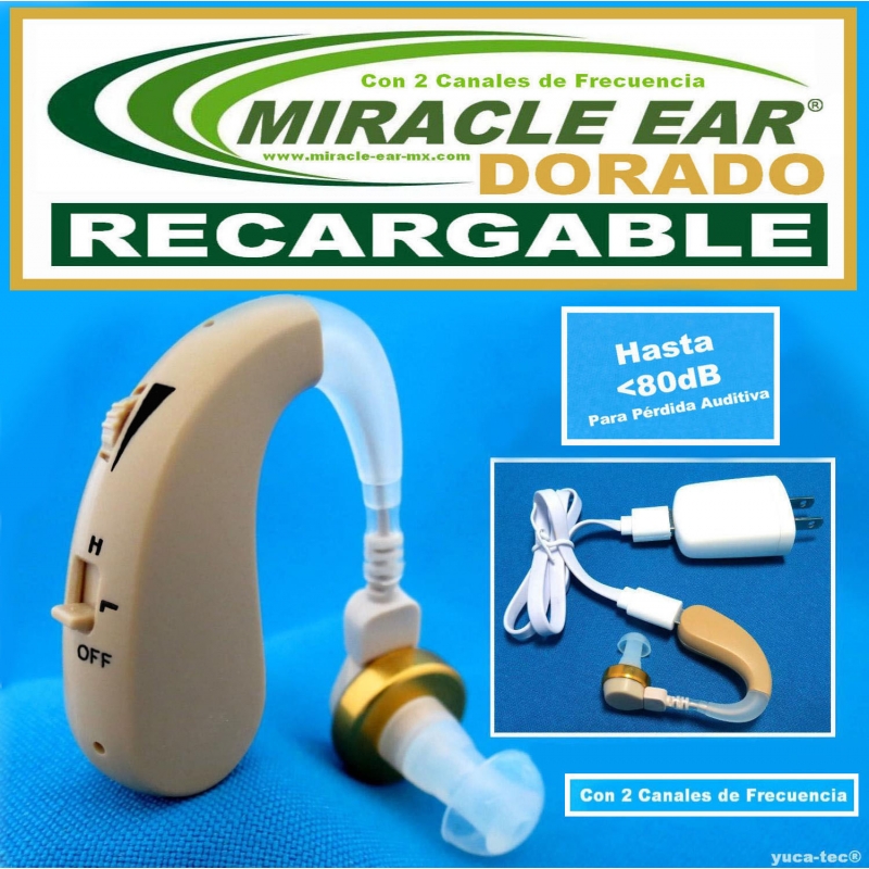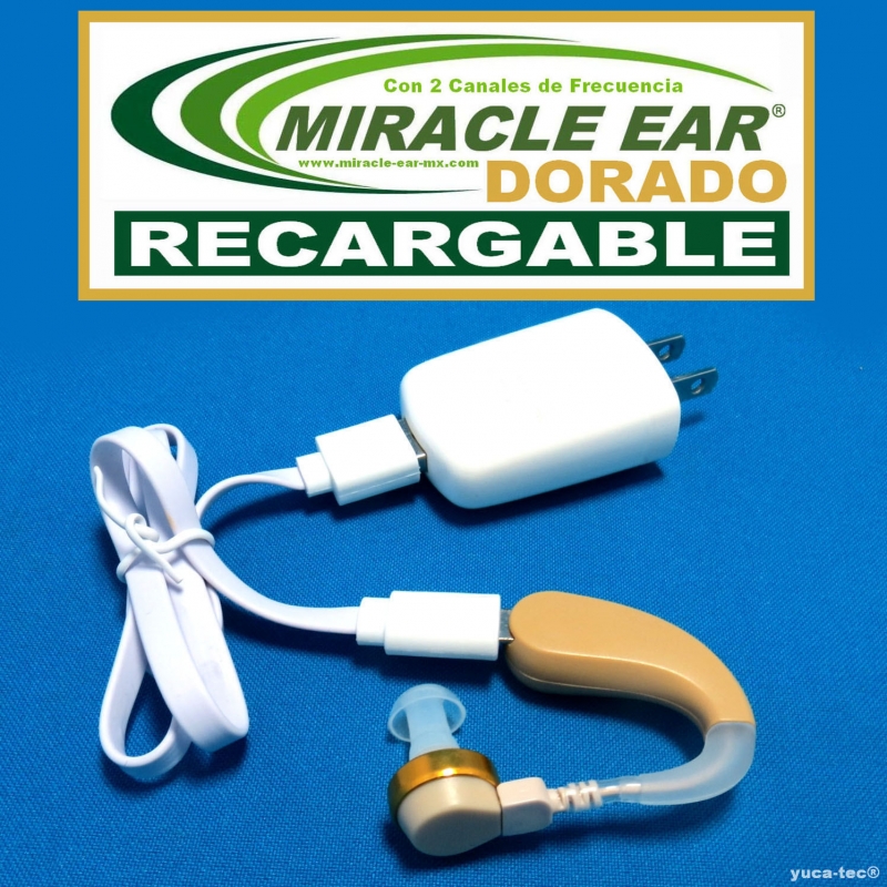 Aparato Auditivo MIRACLE EAR® DORADO RECARGABLE - Estilo Curveta Con 2 Canales de Frecuencia Incluye: