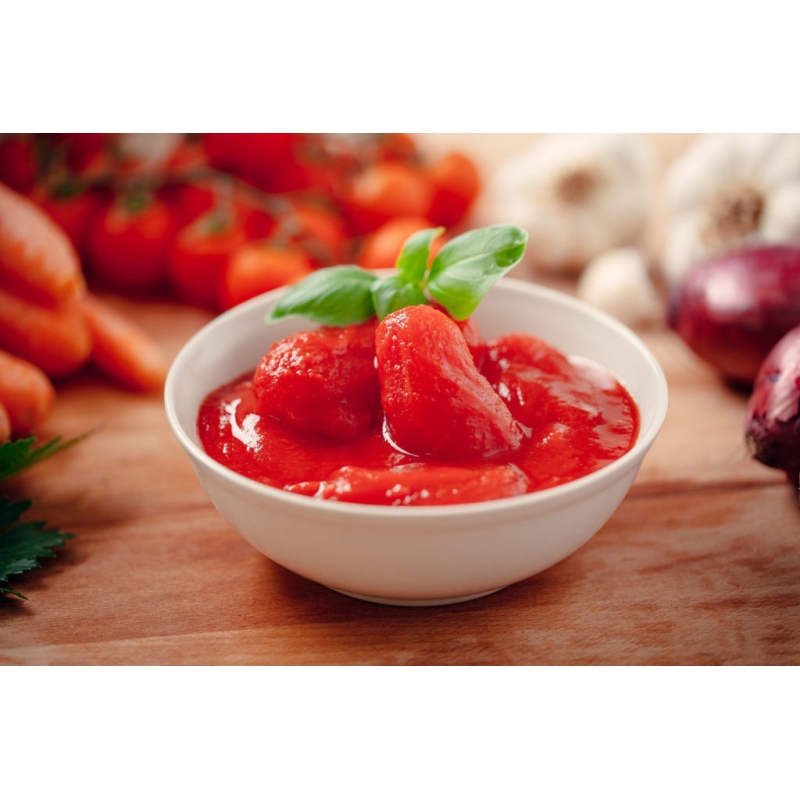 Jitomate Entero Pelado "Orlotti" (Formato Institucional 2.55 kg) El estándar de oro para la cocina italiana. A diferencia de las pastas de tomate procesadas, nuestros jitomates enteros pelados conservan toda la frescura, textura y dulzura natural del fruto madurado al sol.