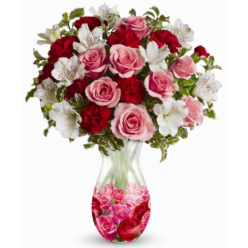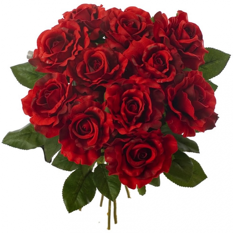 Bouquet de rosas. Con 50 rosas de invernadero, de generosos botones y follaje rojo a combinación, realizamos este arreglo de presencia limpia y a la vez tierna.