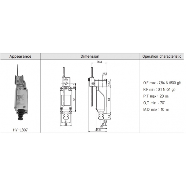 Mini Limit Switch con Actuador de Varilla Ajustable Contacto 1NA+1NC 6amp HANYOUNG