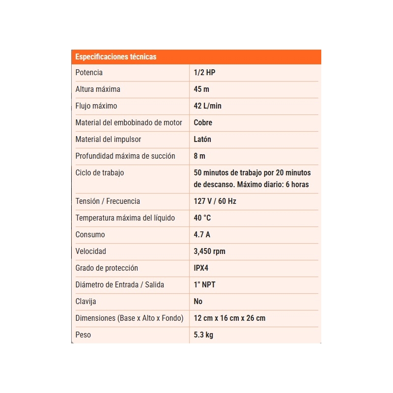 -Recomendada para bombear agua limpia (sin partículas abrasivas)