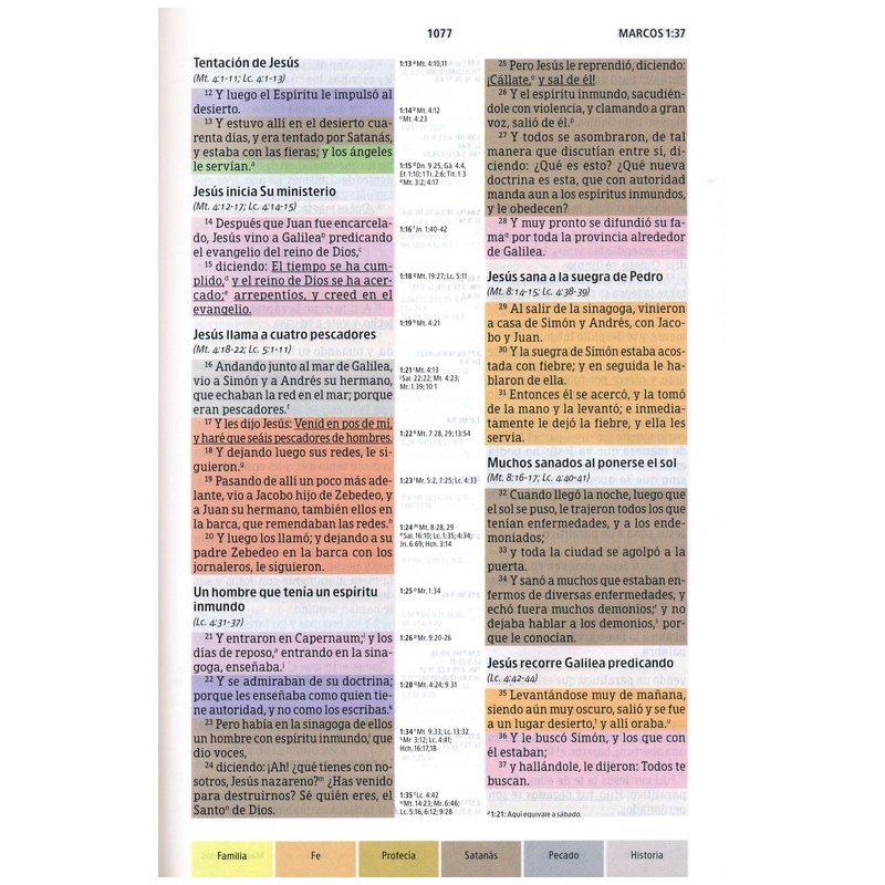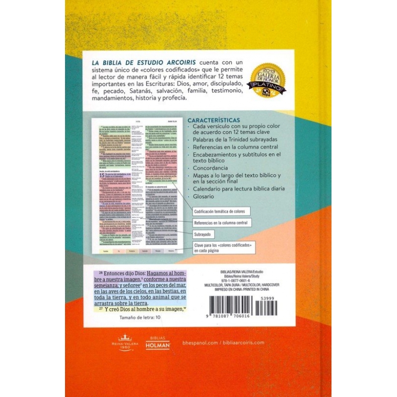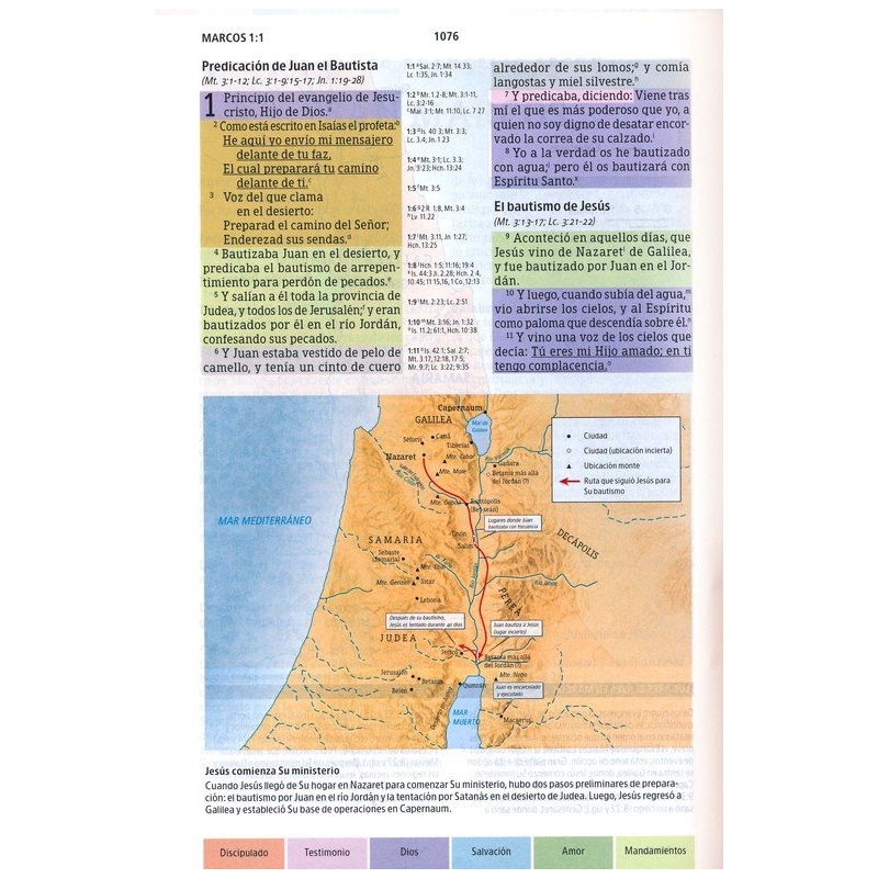 Características: Cada versículo en su propio color de acuerdo con 12 temas clave, edición con las palabras de la Trinidad subrayadas, referencias en columna central, encabezamientos y subtítulos en el texto bíblico, 100 pasajes favoritos, concordancia, mapas a lo largo del texto bíblico y en la sección final, calendario para lectura bíblica diaria, plan para saber qué dice Dios, plan de salvación, glosario.