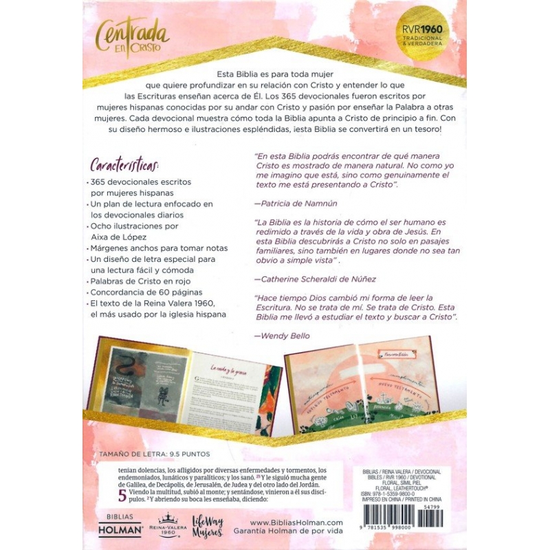 La RVR 1960 Biblia devocional Centrada en Cristo es un extraordinario recurso que provee herramientas, conocimientos y sabiduría para que como mujeres continuemos nuestro caminar junto a Cristo. Conocemos el relato del Mesías, que nació en un pesebre en Belén, pero ¿sabías que podemos encontrar las profecías sobre Jesús en todo el Antiguo Testamento? Cathy Scheraldi de Núñez y Patricia de Namnún junto a un equipo de mujeres latinas de diversos países, han creado un hermoso viaje de un año para mujeres, para que se sumerjan en la Escritura y puedan ver a Jesús en cada uno de los libros de la Biblia. Desde el jardín del Edén hasta la eternidad, la Biblia devocional Centrada en Cristo te ayudará a crecer en la Palabra de Dios.