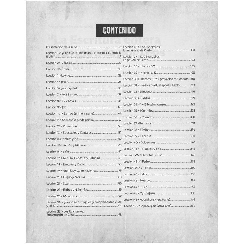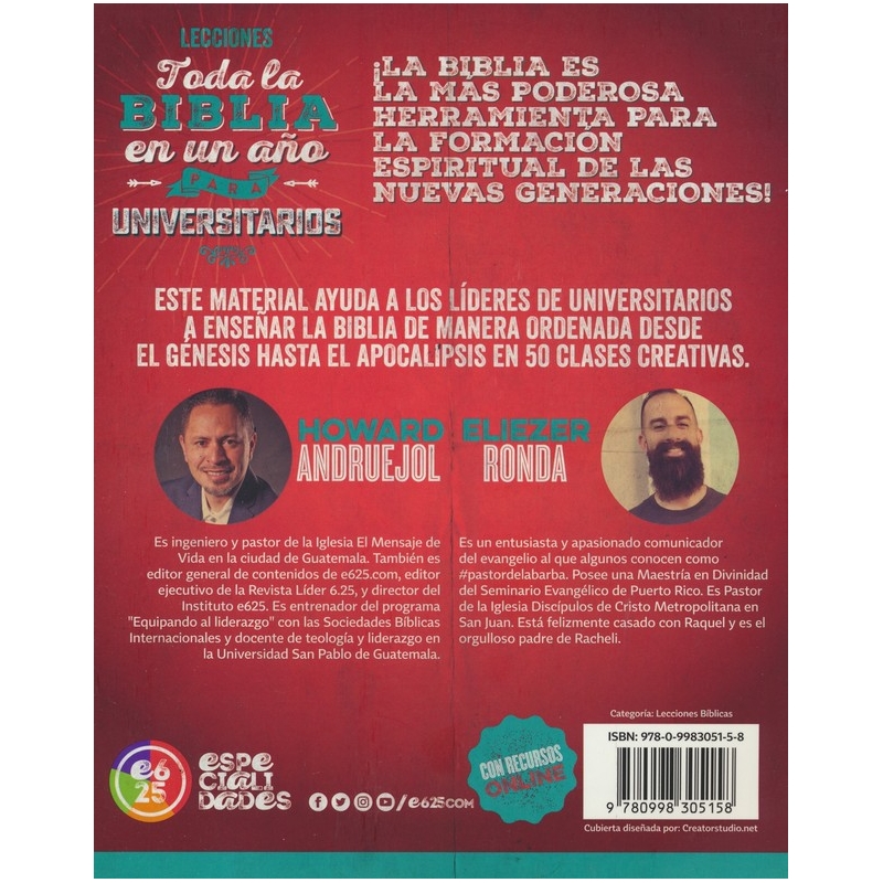 La Biblia es la herramienta mas poderosa para la formacion espiritual de las nuevas generaciones y este material ayuda a los maestros y lideres de jovenes a ensenarla de manera ordenada desde el Genesis hasta el Apocalipsis en 50 clases creativas e inolvidables. Incluye hojas de trabajo y actividades online.