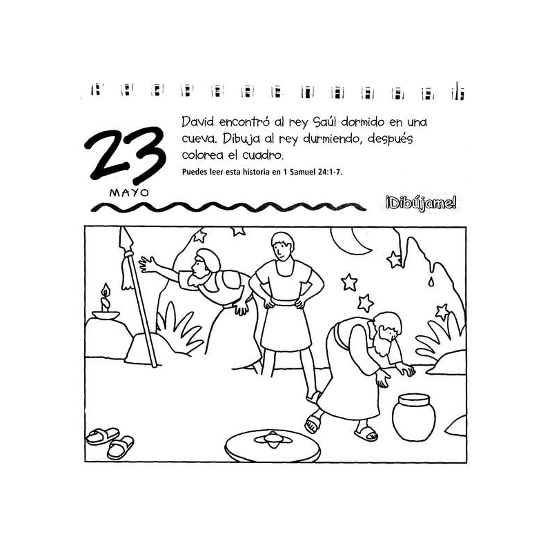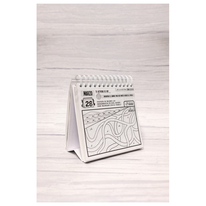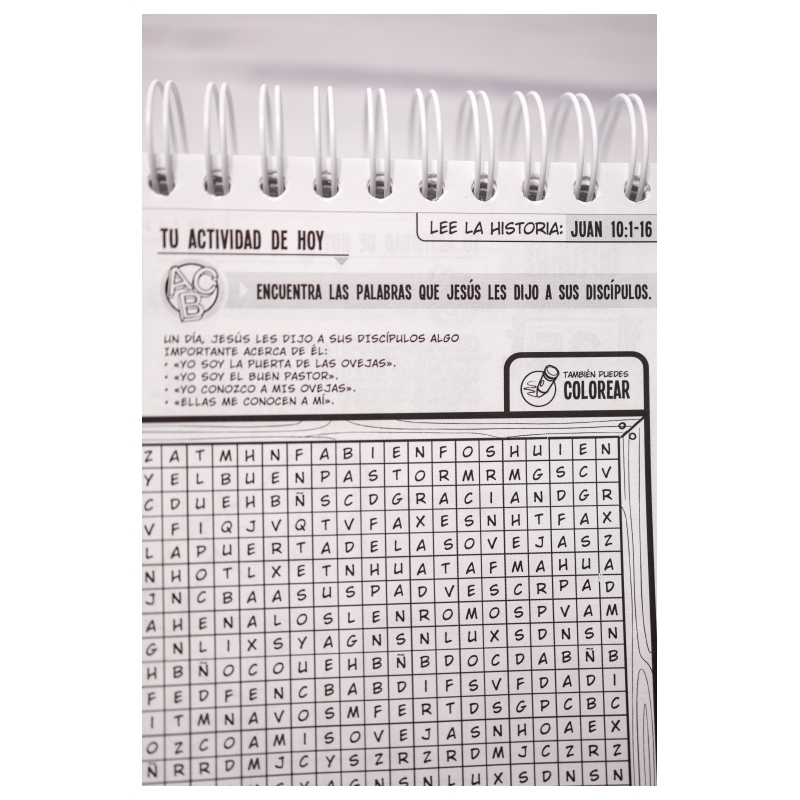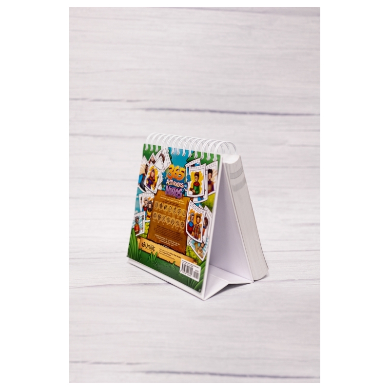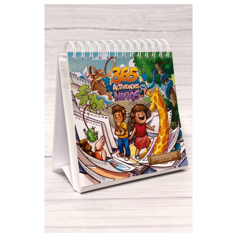 La nueva versión de 365 actividades para niños presenta las nuevas y bellas ilustraciones de las historias bíblicas, desde Génesis hasta Hechos de los Apóstoles. El producto está encuadernado en espiral para voltear las páginas fácilmente, y tiene un soporte integrado que lo mantiene firme sobre cualquier superficie. A través de los dibujos para colorear, los niños aprenderán sobre las historias de la Biblia de una manera divertida, pudiendo comenzar en cualquier momento del año. Este librito de actividades, incluye: