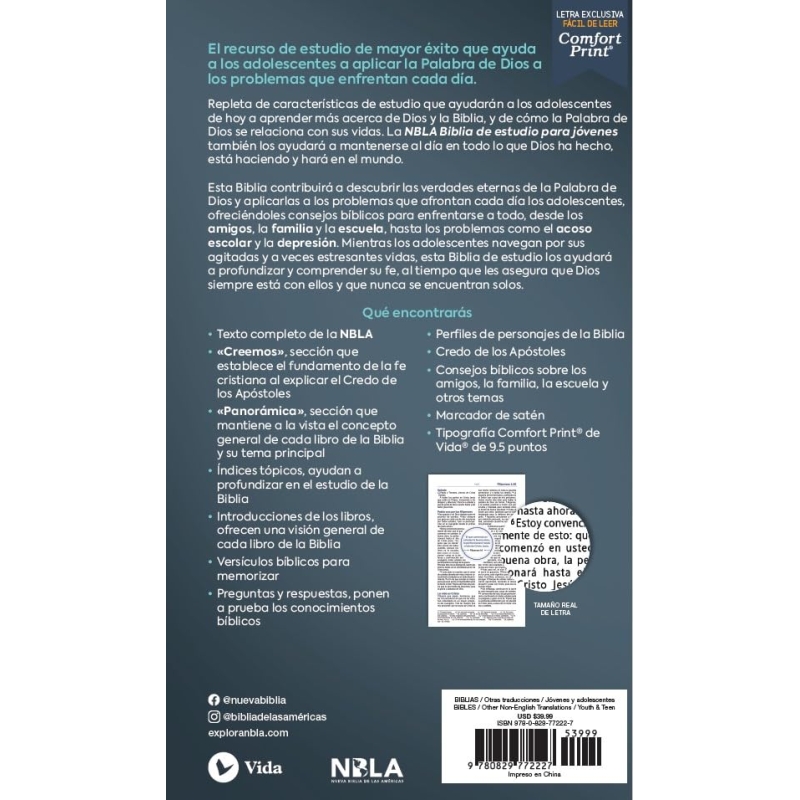 Esta Biblia contribuirá a descubrir las verdades eternas de la Palabra de Dios y aplicarlas a los problemas que afrontan cada día los adolescentes, ofreciéndoles consejos bíblicos para enfrentarse a todo, desde los amigos, la familia y la escuela, hasta los problemas como el acoso escolar y la depresión. Mientras los adolescentes navegan por sus agitadas y a veces estresantes vidas, esta Biblia de estudio los ayudará a profundizar y comprender su fe, al tiempo que les asegura que Dios siempre está con ellos y que nunca se encuentran solos.