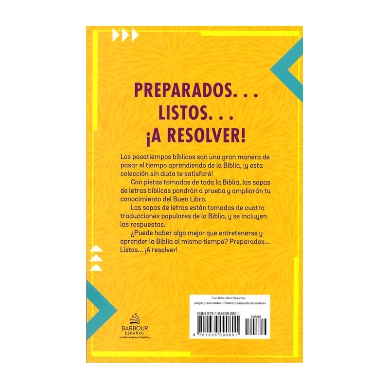 Busca, encuentra y rodea todas las palabras. Los pasatiempos bíblicos son una gran manera de pasar el tiempo aprendiendo de la Biblia, y aquí tienes una colección de 72 sopas de letras que sin duda satisfarán a los aficionados. Con pistas tomadas de toda la Biblia. Divertidas sopas de letras bíblicas pondrá a prueba y ampliar tu conocimiento del Buen Libro. Las sopas de letras están tomadas de cuatro traducciones populares de la Biblia en español, y se incluyen las respuestas.