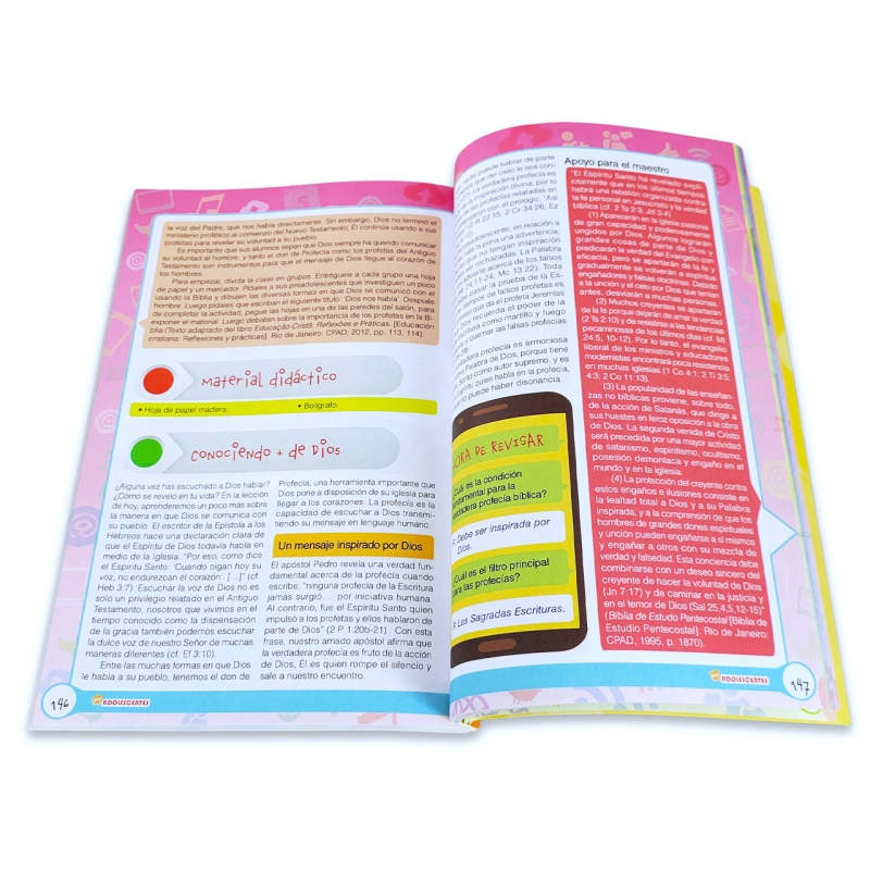En el primer trimestre abordaremos el “maravilloso plan de salvación.” Puede que algunos alumnos en su clase no conozcan la salvación en Cristo. Por eso, sus clases pueden ser una excelente oportunidad para evangelizar. Y, por aquellos pre-adolescentes que ya conocen el plande salvación, pídale al Señor nuestro Dios que los bendiga y que puedan vivir nuevas experiencias con Él. En el segundo trimestre enseñaremos la relación entre “los dones espiritualesy el fruto del Espíritu Santo”. Con cadalección, aprenderemos más sobre la manifestación del Espíritu Santo en la iglesia a través de los dones espirituales distribuidos según las necesidades del Cuerpo de Cristo. Además, el fruto del Espíritu está directamente relacionado con el desarrollo de la vida cristiana. Veremos que para identificarnos como verdaderos instrumentos de Dios no basta con tener dones espirituales, también es necesario tener madurez cristiana y poner en práctica las enseñanzas. Ore al Señor y pídale que le dé palabras de sabiduría para guiar a sus alumnos enla dirección correcta. Que la gracia de Dios sea con usteden cada lección que enseñe.