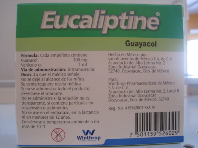 EUCALIPTINE Expectorante. Auxiliar en el tratamiento sintomático de infecciones de vÃas respiratorias altas, incluyendo faringitis, laringitis, bronquitis. DOSIS Y VÃA DE ADMINISTRACIÓN Intramuscular. Dosis recomendadas: Usualmente 2 ampolletas en 24 horas (1 cada 12 horas). Dependiendo de la severidad, la dosis puede aumentarse a 3 ampolletas en 24 horas (1 cada 8 horas) o disminuirse a 1 ampolleta cada 24 horas. ESPERO Y ESTA INFORMACION SEA DE AYUDA SI TIENE ALGUNAOTRA PREGUNTA POR FAVOR NO DUDE EN COMUNICARSE CON MIGO. Tel 877 772 0076