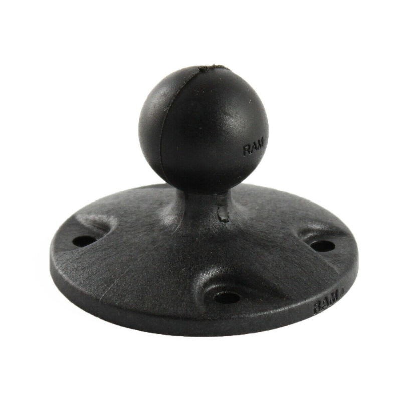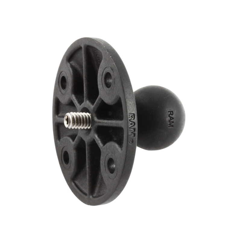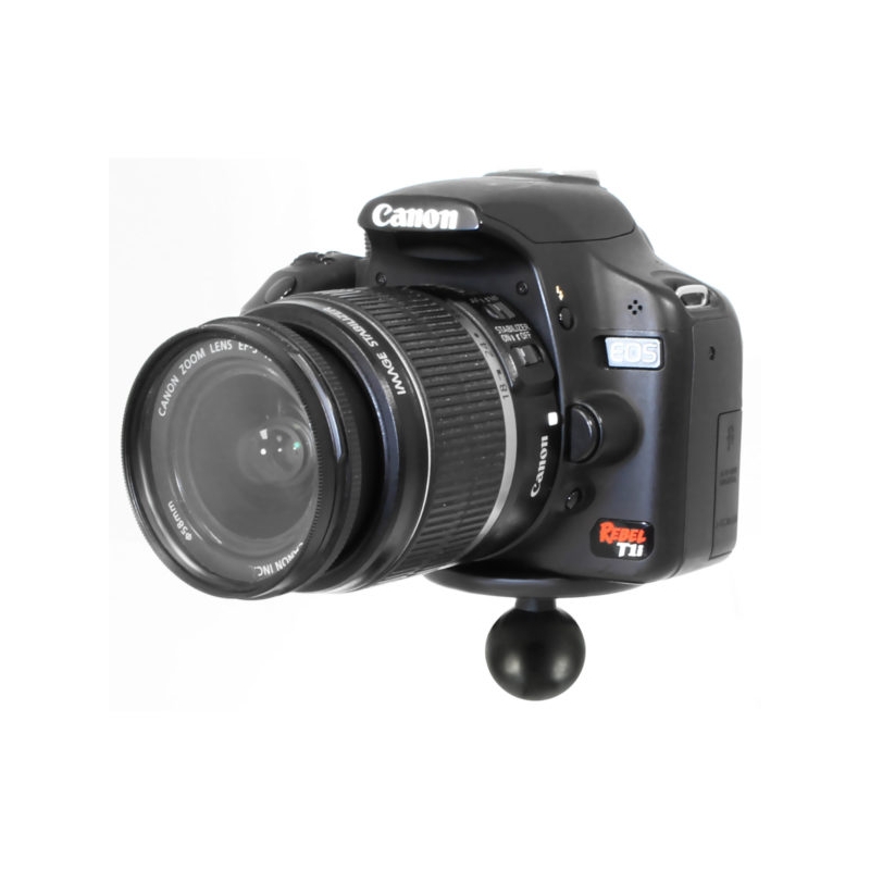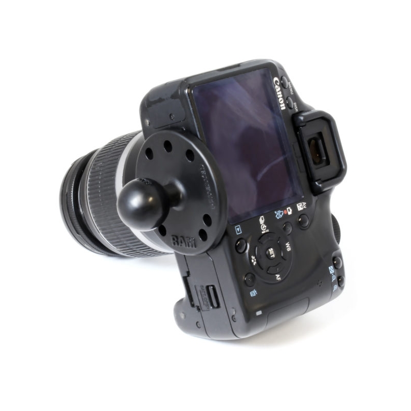 La base de la cámara RAM contiene una bola de goma de 1 "que está conectada a una base redonda de 2.5" de diámetro. Además, se incluye un perno de acero roscado de 1/4 "-20, centrado, la base redonda proporciona soporte y estabilidad para las cámaras que descansan sobre él. El perno de acero roscado de 1/4" -20 se conectará a cualquier hembra estándar hilo encontrado en videocámaras y cámaras digitales.