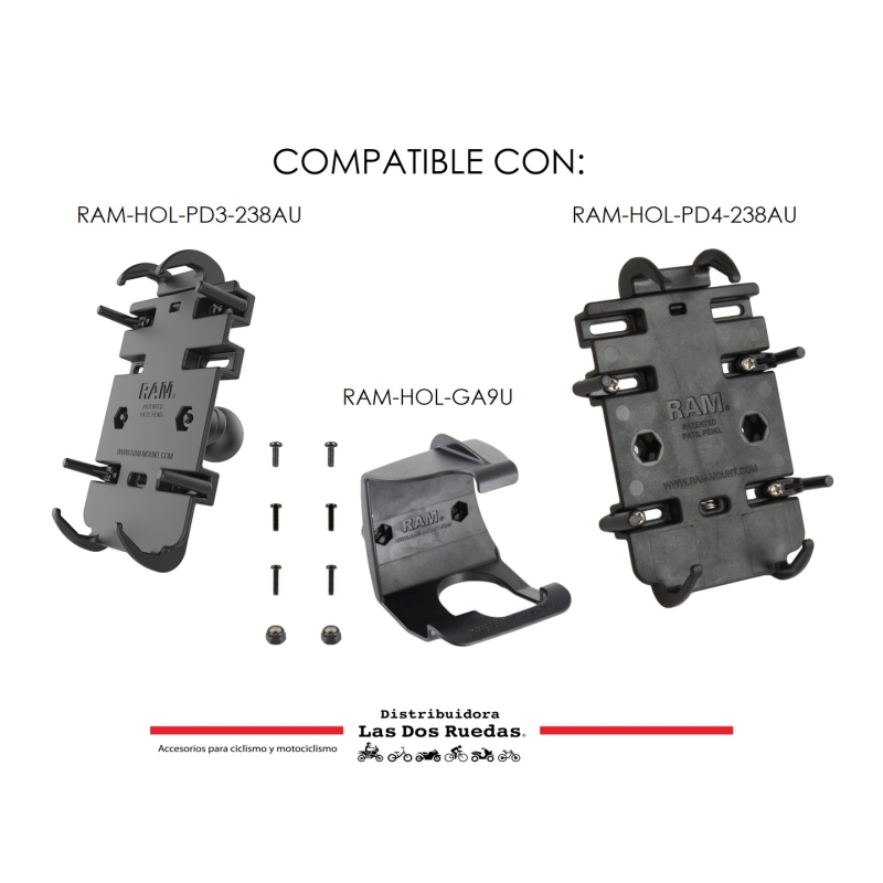 La base diamante tiene un patrón de orificios que coincide con el patrón de orificios AMPS estándar de la industria y se conecta a una gran variedad de componentes RAM® como bases plásticas para SPOT o navegadores Garmin o bien la bases de la linea QUICK GRIP de Ram Mount para teléfonos.