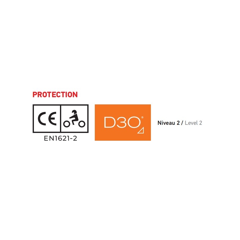 Una capa construida en D3O, un material muy suave cuyas moléculas se bloquean al impacto, absorbiendo la energía cinética. Esta tecnología permite crear protectores suaves, ergonómicos y ligeros de alta calidad