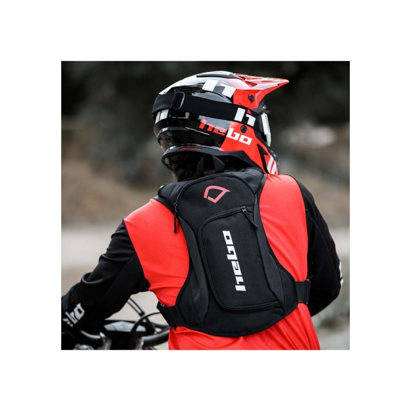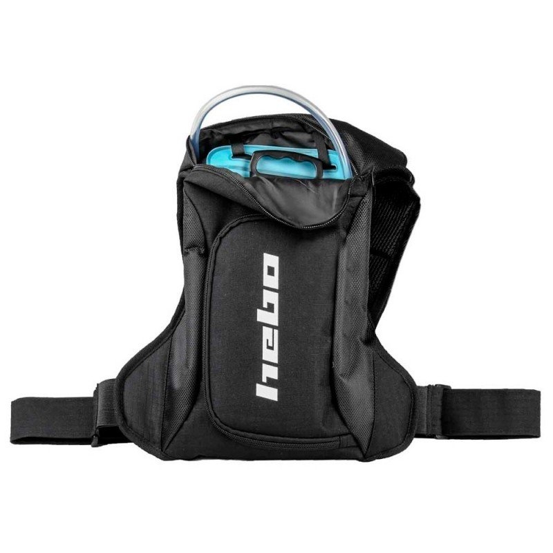 Mochila para hidratación de la prestigiosa marca HEBO, hecha de resistente poliéster 300D completamente opaco, cuenta con una rejilla 3D y cierre de 4 puntos en el pecho. Cuenta con una bolsa de hidratación de 2L con manguera y boquilla, con protección anti bacteriana.