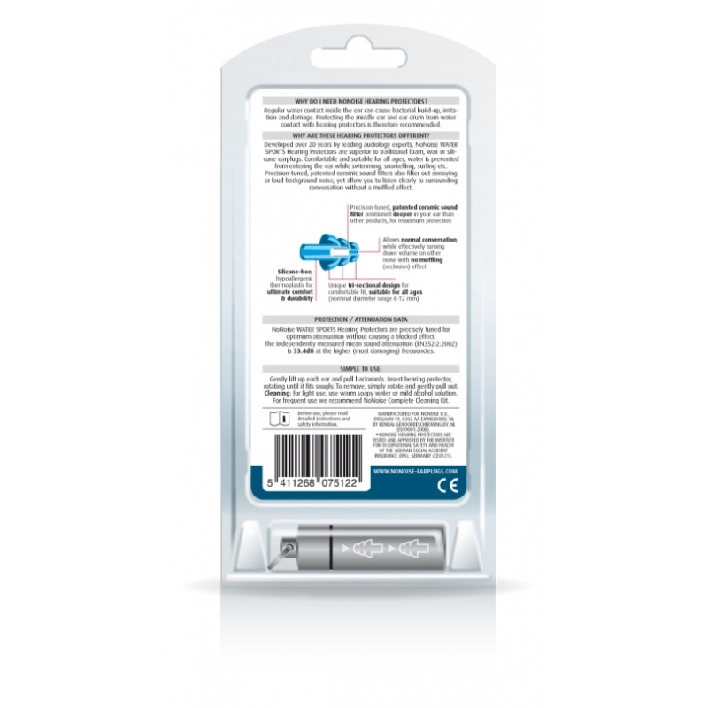 Los tapones para los oídos para deportes acuáticos NoNoise™ también protegen su audición de niveles de ruido dañinos y permiten que los sonidos y las conversaciones cercanas permanezcan claramente audibles, sin un efecto de amortiguación (oclusión). Se ajustan cómodamente y duran mucho tiempo, incluso con el uso diario.