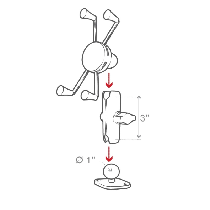 El kit completo RAM-B-102-UN10U consta de un soporte RAM-B-238U con una bola de goma de 1" que se puede instalar en todo tipo de superficies planas en todo tipo de vehiculos, un brazo mediano de aluminio y una base universal X-Grip modelo RAM-HOL-UN10BU con resorte para teléfonos grandes y extra grandes.