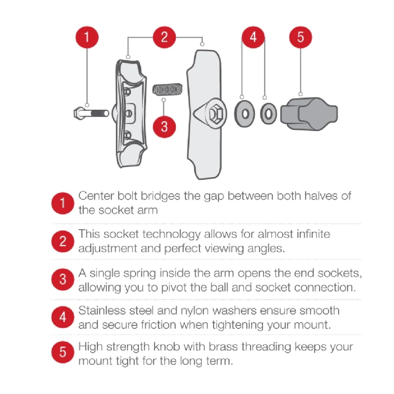 El brazo de aluminio grado marino con longitud media ( RAM-B-201U), tiene una entrada en ambos extremos que se adapta a las bolas de tamaño B de 1". Un único resorte dentro del brazo mantiene abierta la toma, lo que permite insertar la bola en la conexión. La tecnología de socket de RAM permite un ajuste casí infinito para lograr el ángulo de visión perfecto.