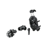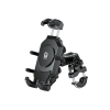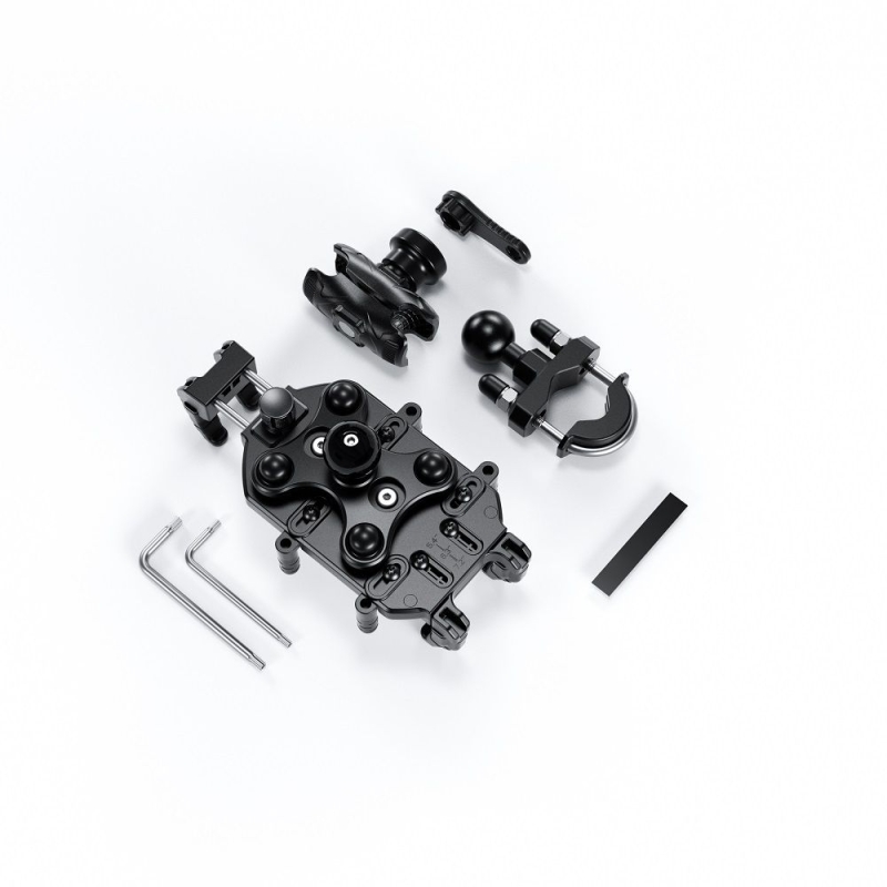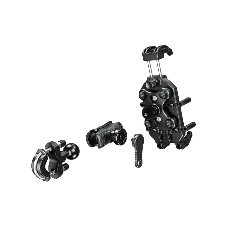 El sistema de bola de 1” permite múltiples ajustes para un ajuste perfecto en el manillar de su vehículo . Dos pernos en “U” permiten que el soporte con bola de 1” pueda ser montado en rieles de un rango .5” a 1.25” El brazo de doble zócalo de 6.14 cm. (corto) e incluye una llave y tuerca de seguridad para mayor seguridad y dificultar el quitar el soporte sin la llave.