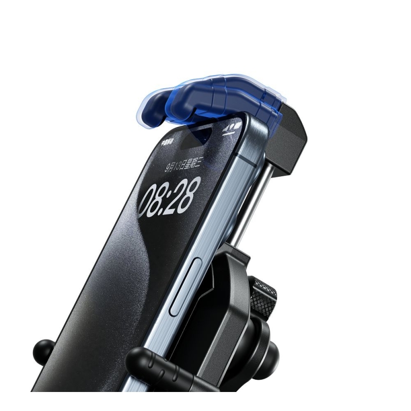 El teléfono se inserta a una sola mano empujando el sujetador superior hacia arriba el cual se expande y retrae fácilmente y que se asegura una vez en un su sitio con una perilla de bloqueo sujetando firmemente su teléfono aun en los caminos accidentados.